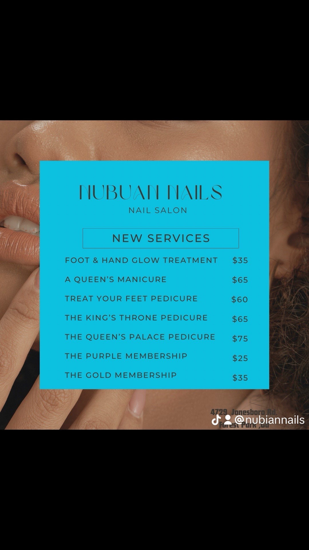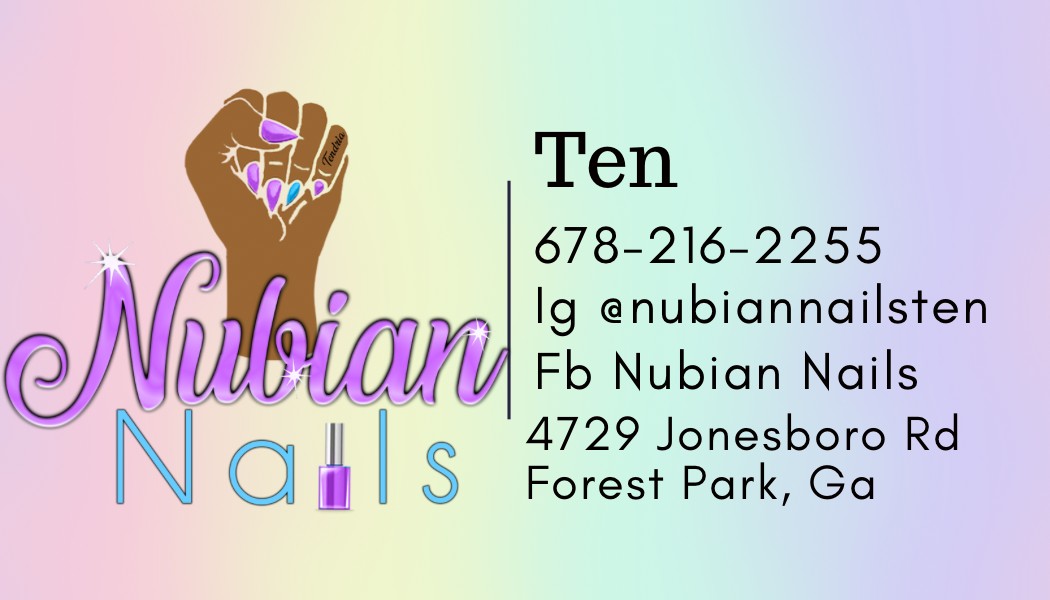 - Website: https://www.fresha.com/a/nubian-nails-forest-park-4729-jonesboro-road-u6jm78yz/booking?fbclid=PAAaYml61gNAySqJxBLN3WKlvN1-ISYwJKCKu34fiTH32qzvOJu5HNGDwonb0_aem_ATd8wMKl9T6jGc0PuUYy7QEEXKONlGMsc8I-ckpe7SSPnkc_SZ4qOOtolTgfZI8GHN8
