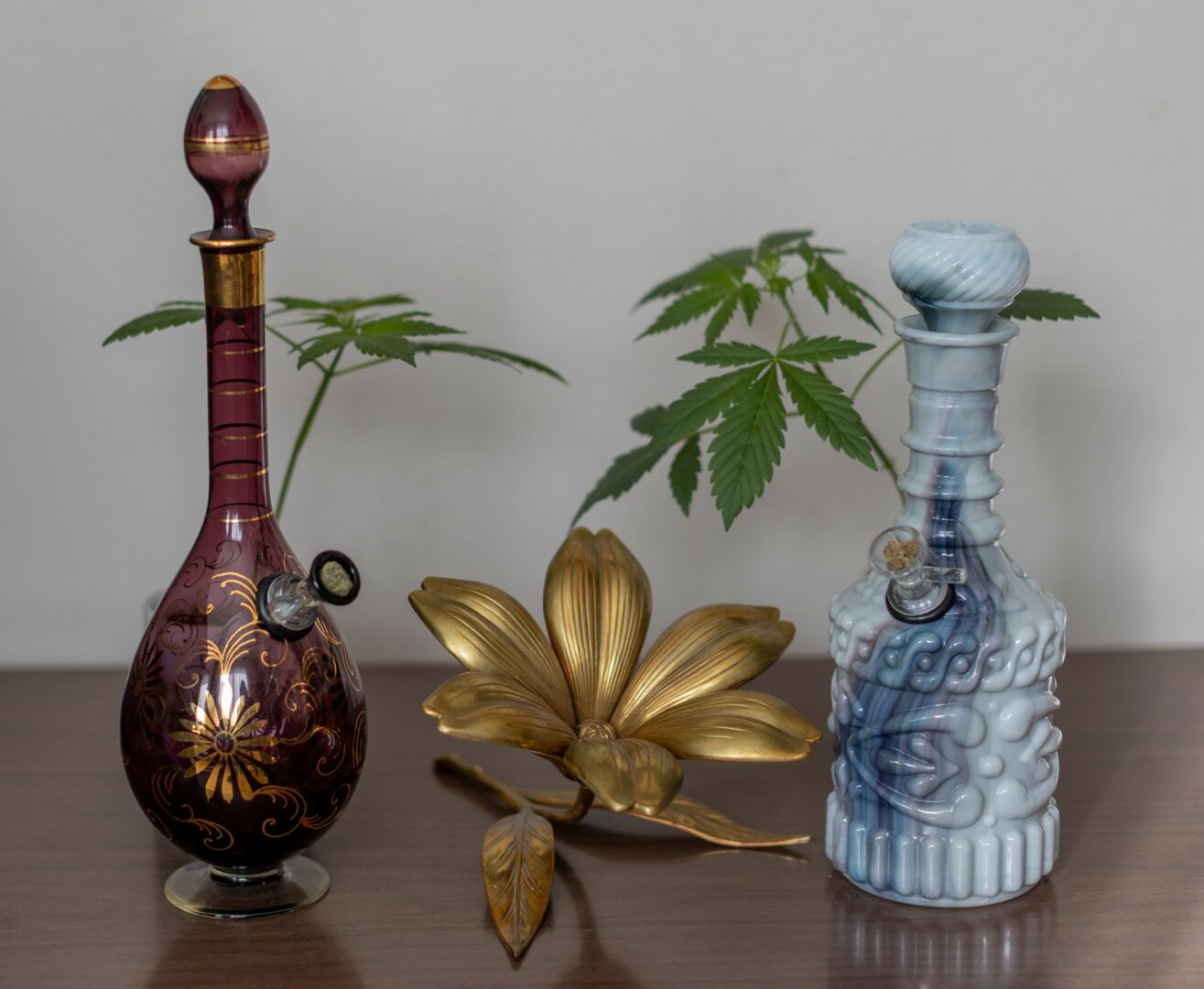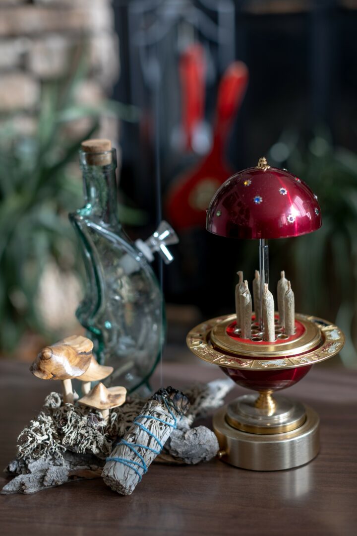 As the artist and curator behind Let’s Get Thrifted, I specialize in finding vintage goods and home decor, as well as upcycling decanters to fully functional smokewares. I locally source each unique piece and display them together alongside my waterpipes in collections of “grass stations.”