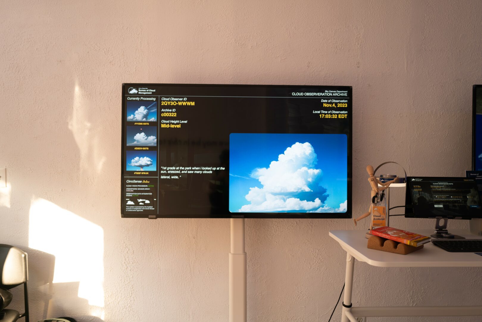 Currently, much of my focus is on further developing my collaborative art project, “Bureau of Cloud Management”. In this project, my collaborator Yuguang Zhang and I imagine a speculative scenario in which a machine might try to understand something as abstract and ever-changing as a cloud. It’s about more than just technology—it’s about the human-like struggles these intelligent systems might face when they lose their grip on concepts we take for granted. We’re working on expanding the project by inviting the audience to join this experience more deeply, to see through the ‘eyes’ of an AI as it tries to overcome struggles. This immersive journey reflects not just on AI but on our own ways of making sense of the world around us, and I find it an exciting space for connecting human perception with machine learning in unexpected ways.