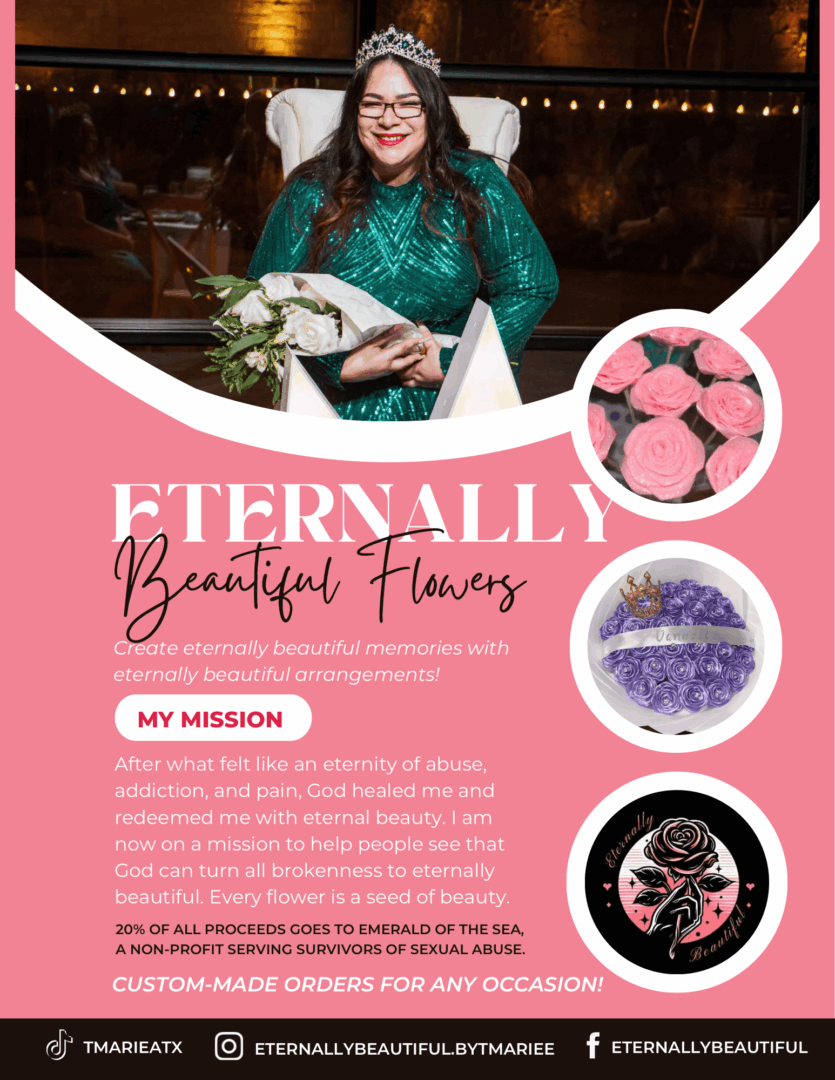 All of my life I have dreamed of being a woman who could give back to women like me. As a teenager, my dream was to become a juvenile probation officer. I wanted to be able to give children and young adults what I lacked…love and protection. I imagined growing up and sitting in an office talking to a troubled teen who just needed someone to love on them, someone that would listen to them and make them feel heard and safe. I dreamed of giving them hope to overcome whatever circumstances that had lead them into a juvenile detention center. I wanted to be someone who could plant seeds of hope for a better future. I lived a life of abuse being sexually abused throughout my childhood from the age of four up to the age of 11. At age 11, once the abuse stopped, I picked up a drug habit and quickly fell into a life of addiction. At 14, I met the man that I would spend the next 20 years of my life with. The abuse continued. I was in a domestic violence relationship filled with more abuse and toxic cycles. During that relationship, we had four beautiful children. In 2021, after going back and forth with my now ex husband since 2017 due to a trauma bond, I knew that I wanted a change. Not just for myself, but for my children. They had been through enough. They had witnessed enough. It was time to put my healing first to become the best version of myself. Around October 2021, I heard of this amazing non-profit called Emerald of the Sea whose mission is to lead survivors of sexual trauma and exploitation to the hope, healing, and freedom found through Jesus Christ. I knew right away that this is where I needed to be. I joined the program in January 2022 and began a 2 year mentorship program on a journey to heal from past wounds from not only my childhood, but from the domestic violence relationship I had endured so much trauma and ptsd from. I knew from the start that this program was not only going to be a program that I walked through, but that I was going to be someone who grew with the organization to eventually give back and help women just like me! It was literally a God-send. I could see my dream of giving back coming to fruition right before my eyes. In March 2024, I began making eternal roses. The first ever bouquet I hand crafted was a Valentine’s Day gift for a young lady and as I was making these roses I was reminded of a promise I received from God to become an entrepreneur. I thought, “this is it, I am going to make Eternally Beautiful gifts to last a lifetime and plant seeds of eternal beauty.” My mentor, very close friend, sister, and the executive director and founder of Emerald of the Sea, Esmeralda Ridilla has played a major role in my healing journey. She was the woman to me that I needed when I was a child. She has helped me to see my worth, she has believed in me and encouraged me along the way and has helped me to grow in my business. I couldn’t have done this alone. Had it not been for an organization that she has built from the ground up, I would have never met her and found the healing that I needed to be able to become the woman that I am today. I found my purpose by doing the work and being surrounded by women who truly love and care for me, who challenge me, and who believe in me to do all the things that I have dreamed of. My purpose is to love everyone that I come into contact with, that I cross paths with. Now, I can love on them by creating eternally beautiful gifts creating eternally beautiful memories while planting seeds of eternal beauty with each rose that is gifted.