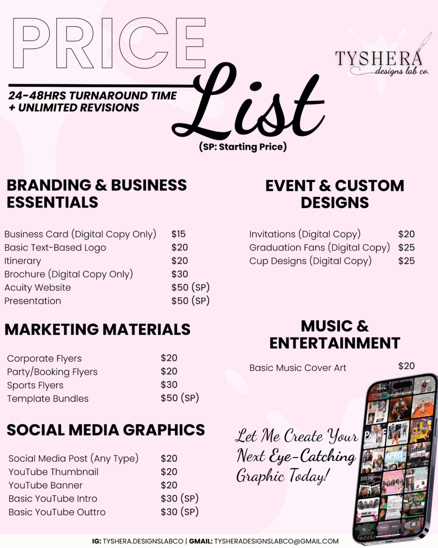 My name is Tyshera, I’m a 25-year-old creative from Baltimore, Maryland. I earned my Masters degree in Media in May 2024 and originally planned to focus on social media management. But along the way, I discovered my passion for graphic design. Once I started creating graphics, something clicked, and I knew this was the path I wanted to take. In January 2025, I officially launched my design business, Tyshera Designs Lab Co.