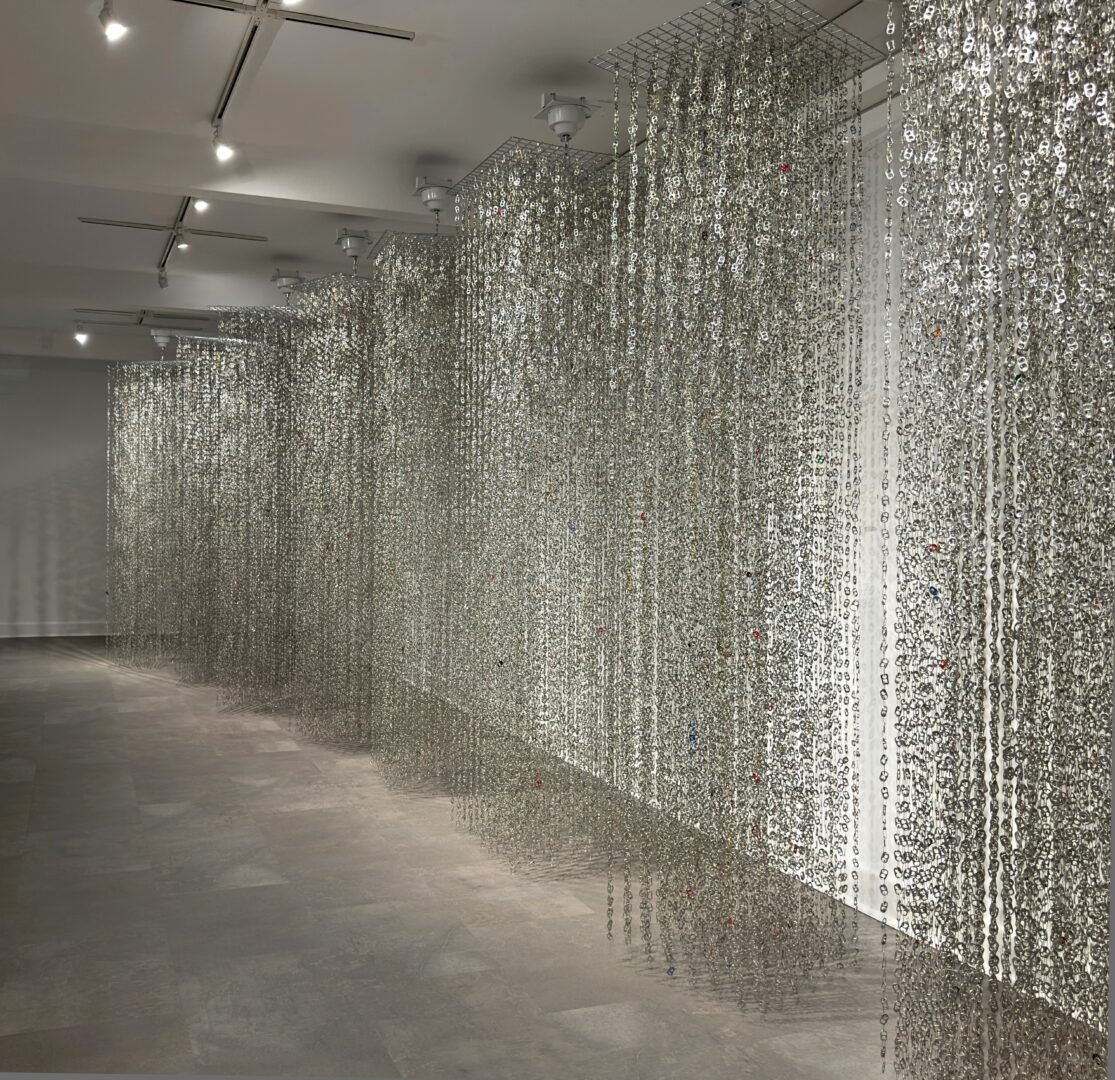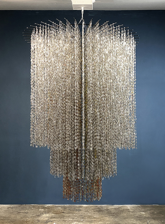 My art practice is rooted in the belief that our senses serve as a gateway to our innate knowledge, our original place of knowing. I create intricately crafted sensory objects and environments from post-consumer materials imbued with notions of luck, chance, and magical thinking. The resulting artworks draw on baroque aesthetics that resonate with symbolism and transcend the original utility of the materials; sparkling chains of can tabs and safety pins transform into oversized, shimmering chandeliers that generate mesmerizing moiré patterns. Metal bingo cages, bingo chips, and raffle drums are retooled into hand-cranked sound baths and luck generators, each with a unique sonic signature.