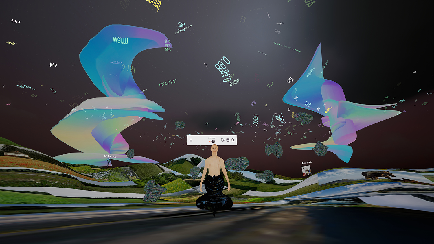 My latest work is a self-exploration based on my personal data with internet-based technologies, utilizing the web, video, virtual reality, and installation. I am using keywords from my memories shared online and figures of my health data captured by my smartwatch to reconstruct myself through virtual avatars, a story of my growth, and new bodies in which to hold these avatars and stories. This also reflects my identity as a newcomer from China, migrating to an open new world that blends analog and digital.