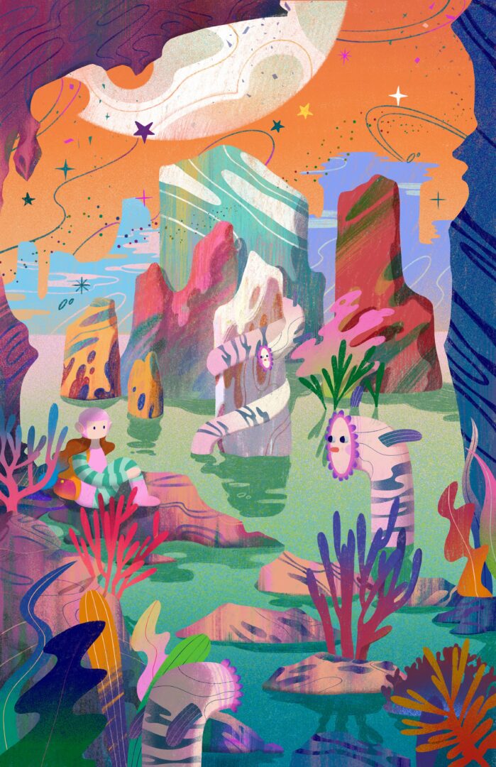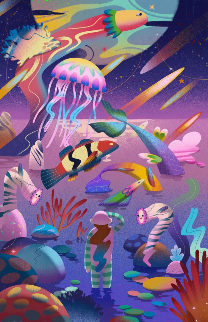 The ocean and nature are also an incredible elixir that awakens my inspiration. As a person who was born and raised by the sea, feeling the ocean itself, the blowing sea breeze and the golden sand, the slow flow of time, and the painted marine life give me the feeling that it is like the artistic gene in my blood waiting for me to discover. I like flowing elements, a rich color palette, a gentle atmosphere, and mysterious exploration. Natural elements often appear in my works, and it is something I love and am happy to express.