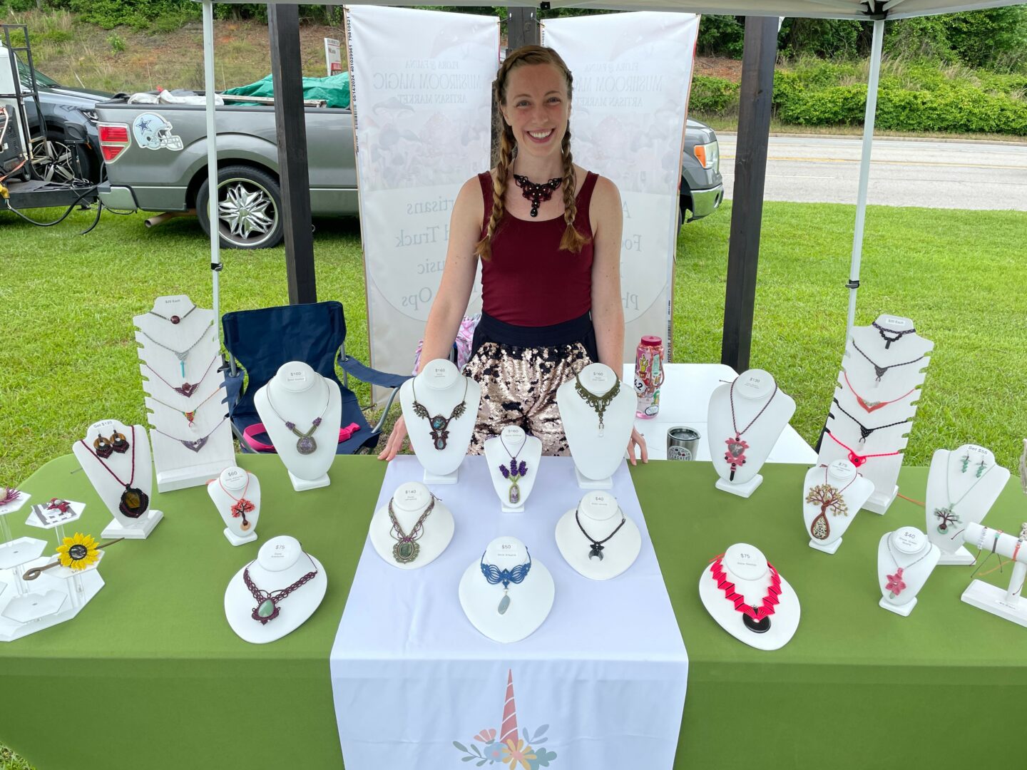 I aspire to create whimsical, fairytale-inspired branding. Each of my pieces is unique, designed around individual stones, as no two stones are alike. Every piece tells its own story, and I aim to convey that narrative. To enhance this storytelling, I write a descriptive story to accompany each creation. I find great joy when a piece finds its perfect match at a market and goes home with someone who will cherish it. My motto is, “Carefully tying nature-inspired jewelry pieces to bring joy to your world.”