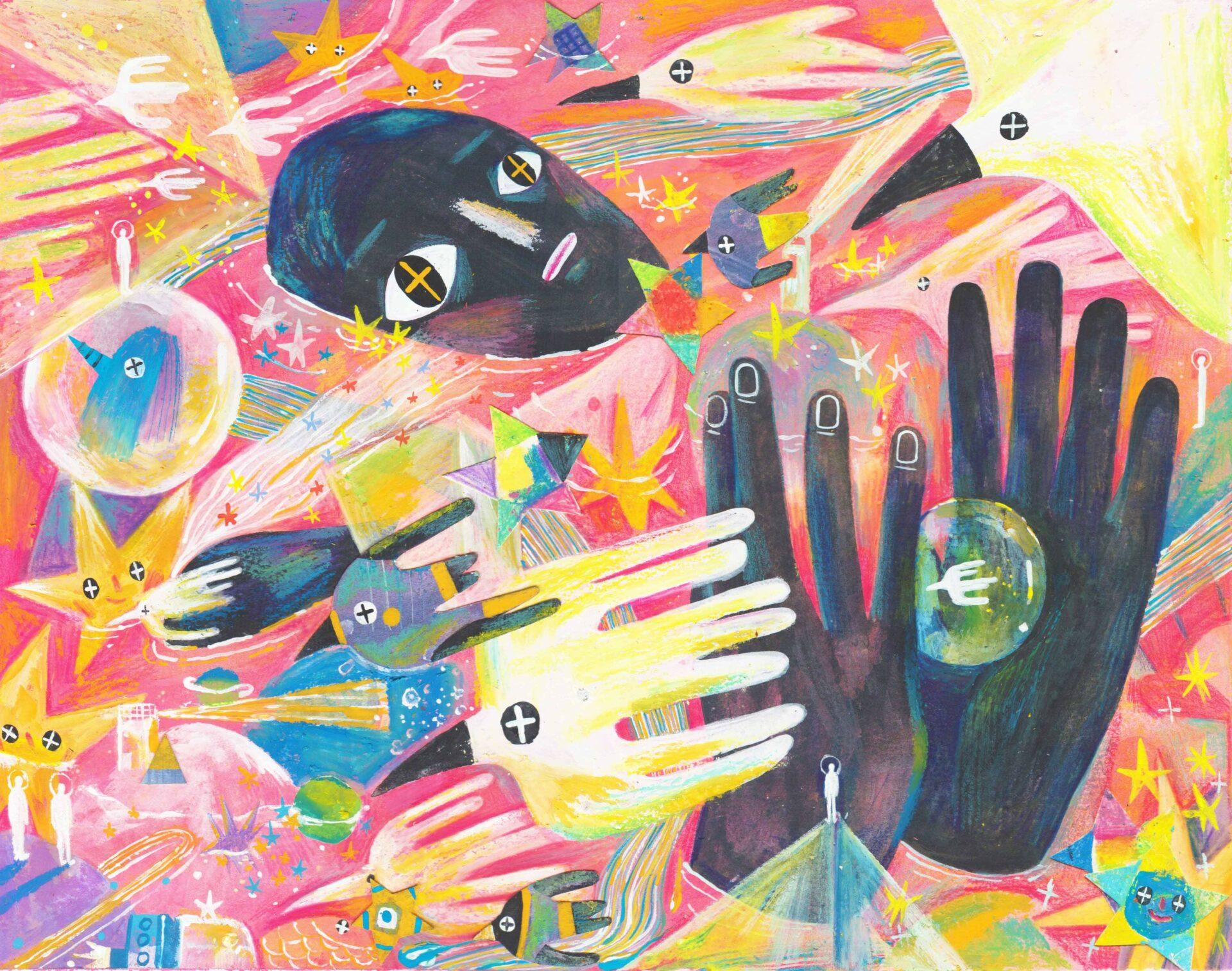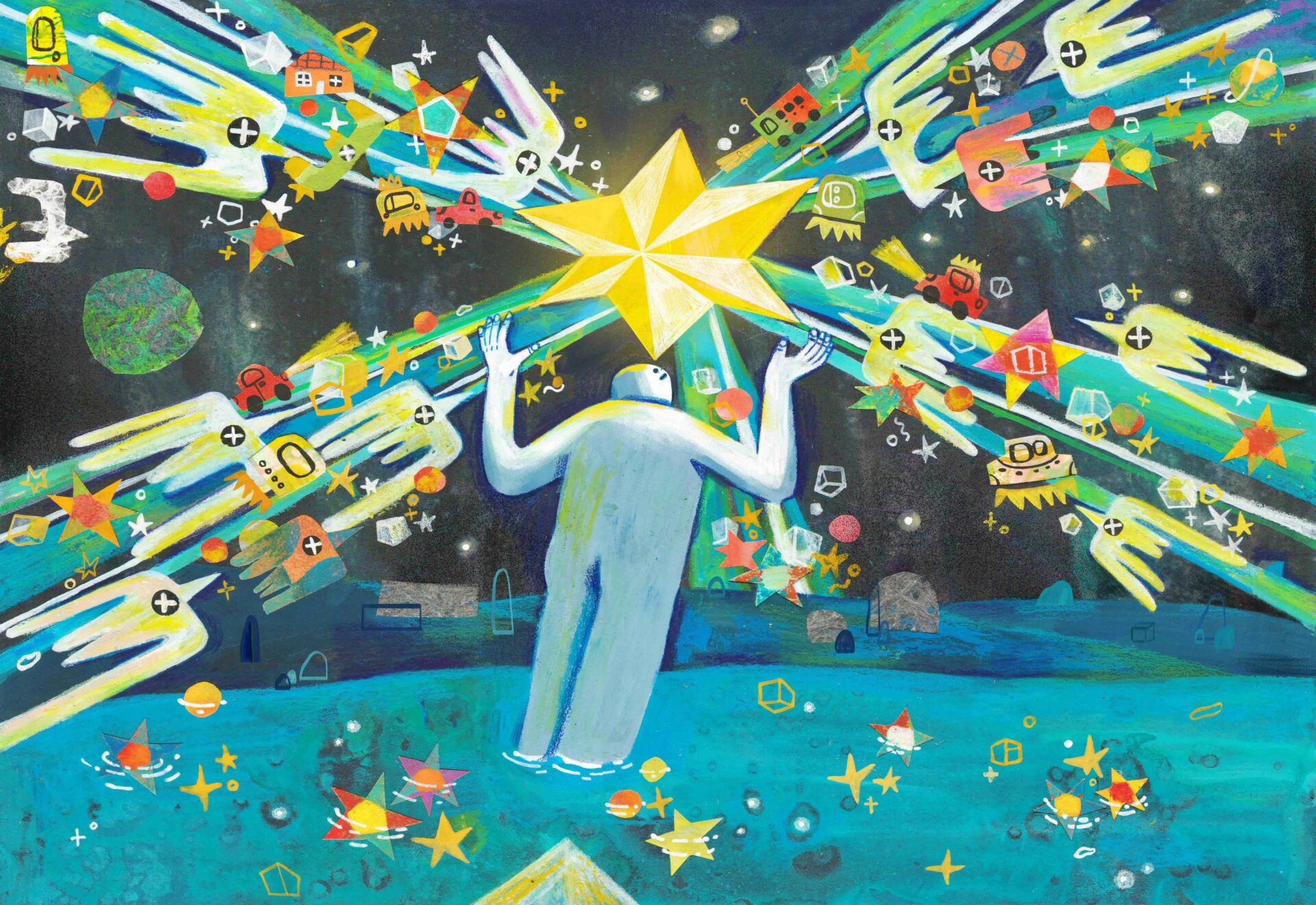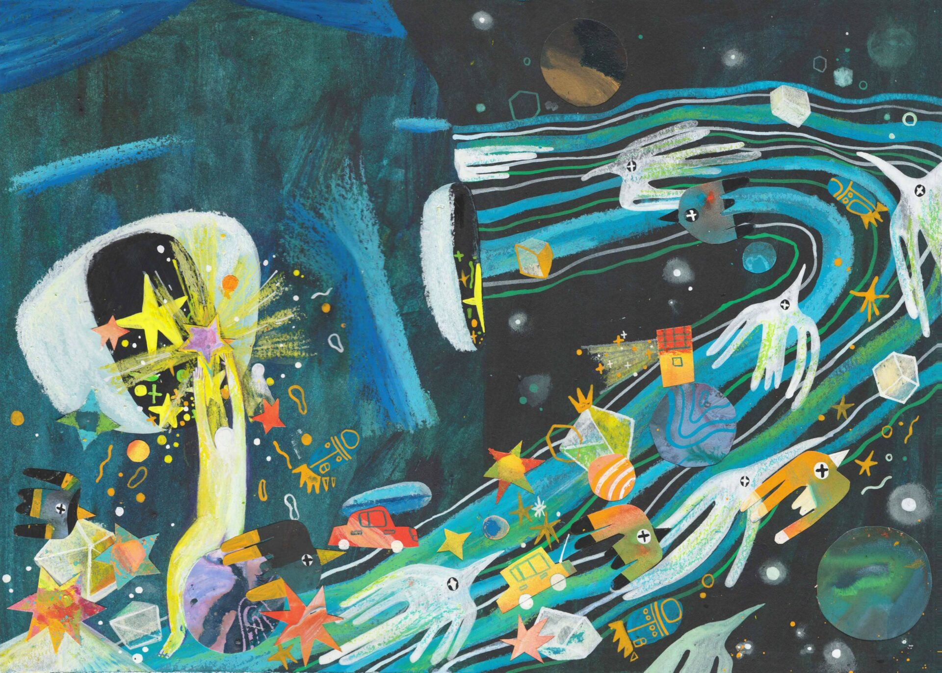 My name is Changyu Zou, and I am a freelance illustrator based in Savannah, Georgia. Most of my creative inspiration comes from poetry and I like to convert my feelings about words into images. Although these words are sometimes very abstract and difficult to understand, they can give me unlimited imagination. I believe that visual language and text have been influencing and blending with each other, so I try to use visual art to express and describe words. I love surrealist paintings; I am addicted to extraordinary imagination and great compositions. Hieronymus Boschd’s paintings, for example, are highly original, imaginative, and make extensive use of various symbols and signs. I think they inspire me to think about the composition, imagination, and graphic elements of illustration. Of course, my style has changed a lot from the very beginning. I think experimenting with a variety of drawing tools can help find the right style of illustration for you. Once I tried some printing tools and collages, I fell in love with these ways, so now I love to draw by hand and create illustrations with gouache, crayon, and collage. And I try to keep the traces and texture of these hand-drawings in my digital drawings.