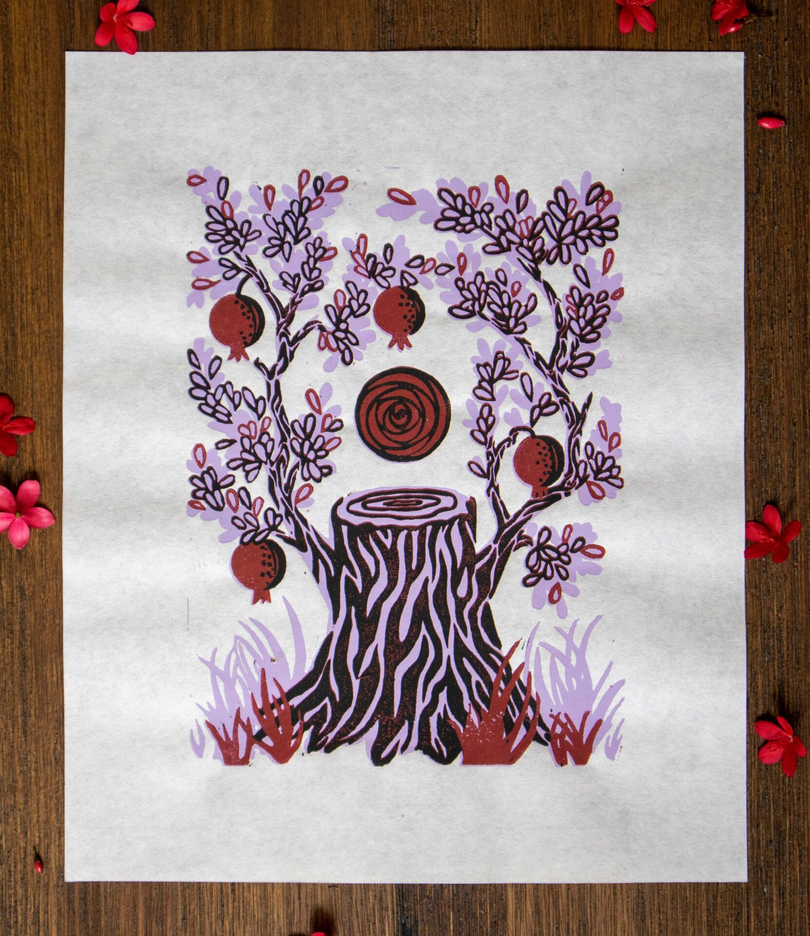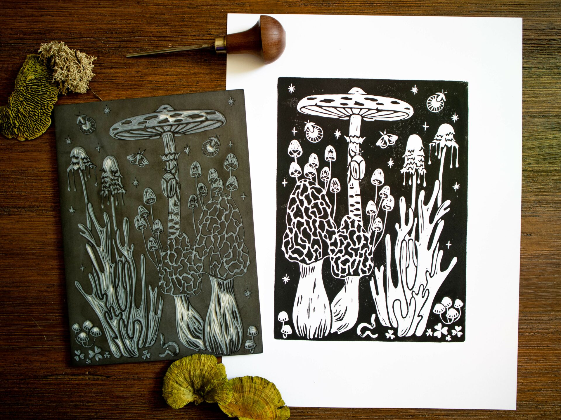 My background in environmental science helped me find the inspiration to create. My education had me taking multiple weekly hikes, and its hard not to find a muse in the small beauty in nature. You could frequently find me crouched down on a trail, taking pictures of a neat lichen I had found, with textures that would translate to an awesome linocut print.
