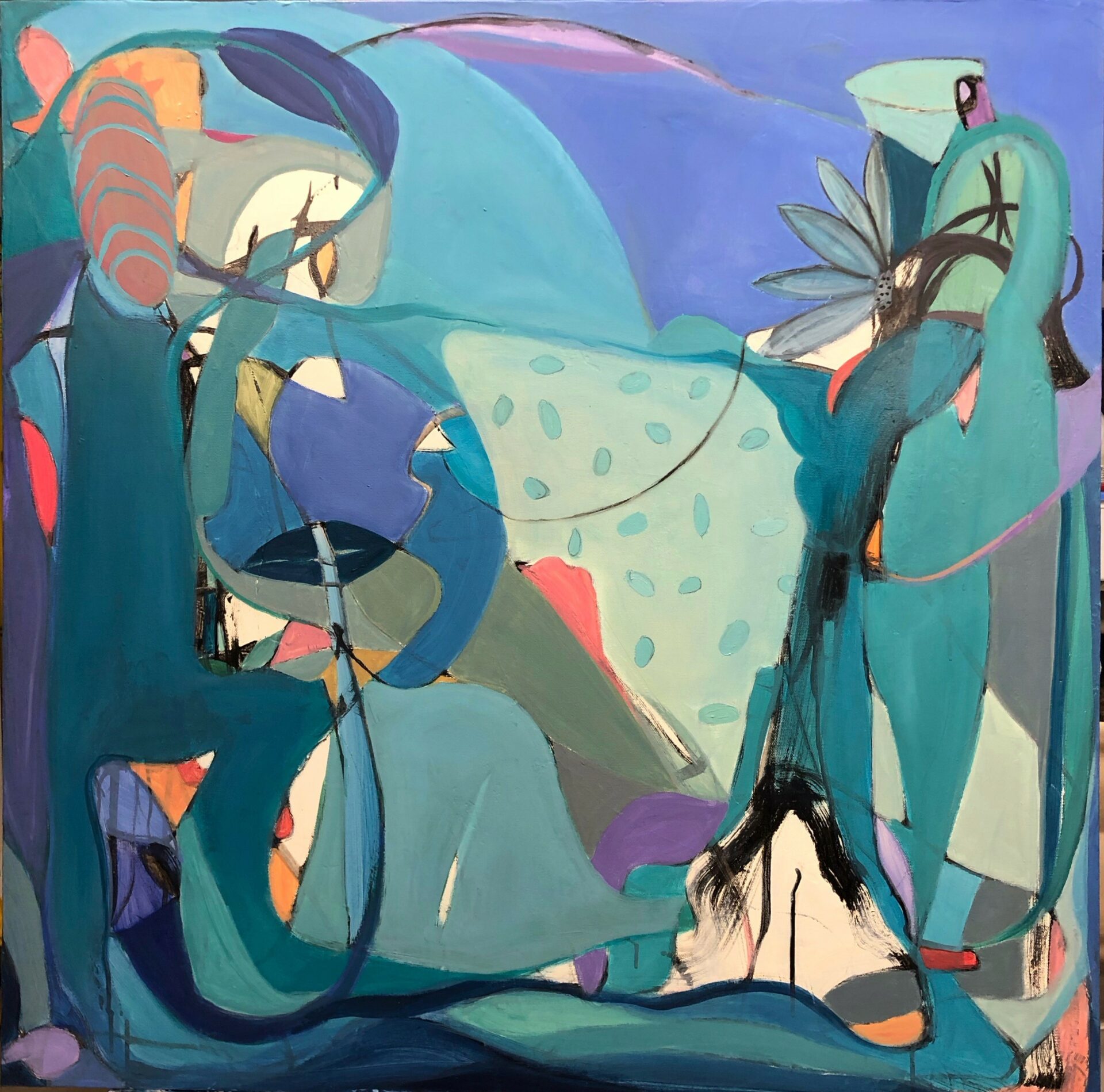 I am an artist whose recent work has been largely focused on biomorphic abstraction which is abstraction that “incorporates a visual language based on biomorphic shapes—bulbous, lush, sumptuous looking forms—that are neither representative nor geometric.” These shapes began to intrigue me during the pandemic when I started a new series with artwork and titles that were meant to be whimsical. I felt that not only I but others needed some comic relief during this rather grim and isolating timeframe. After recently attending a national artist retreat I started working on an offshoot of the biomorphic abstracts using the same underlying technique but creating more recognizable abstracted figures than the original biomorphic artwork. My work differs from many of the artists you see today who are focused primarily on abstract expressionism which fits more neatly in the nonobjective realm. As an artist I strive to create artwork that is innovative and successfully conveys how I interpret the world around me visually and emotionally. My hope is that others continue to appreciate my art and my vision as it evolves over time.