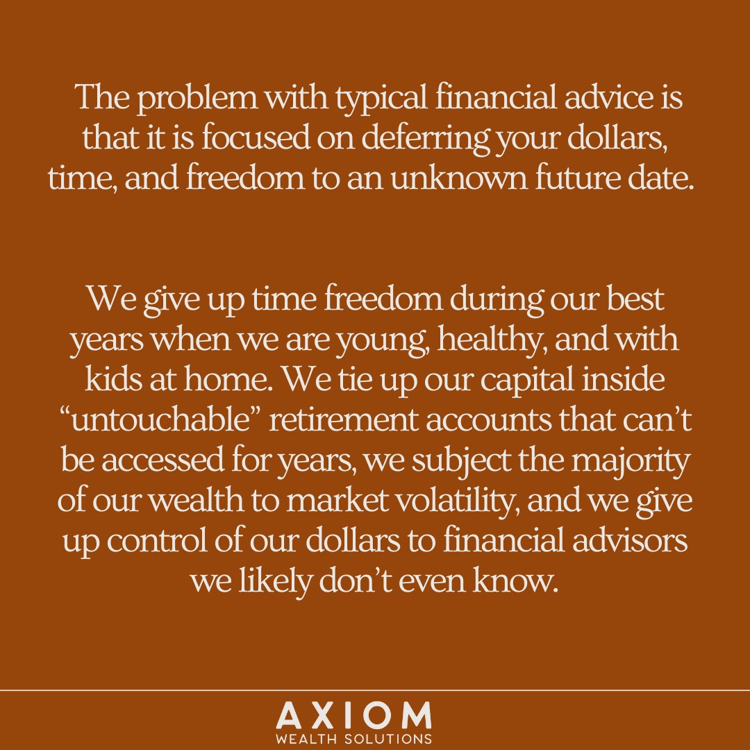 Right now I am 100% focused on my business and sharing our message. At Axiom Wealth Solutions we help our clients accelerate their path to financial freedom in less than a decade so that they can build and live the life of their dreams.