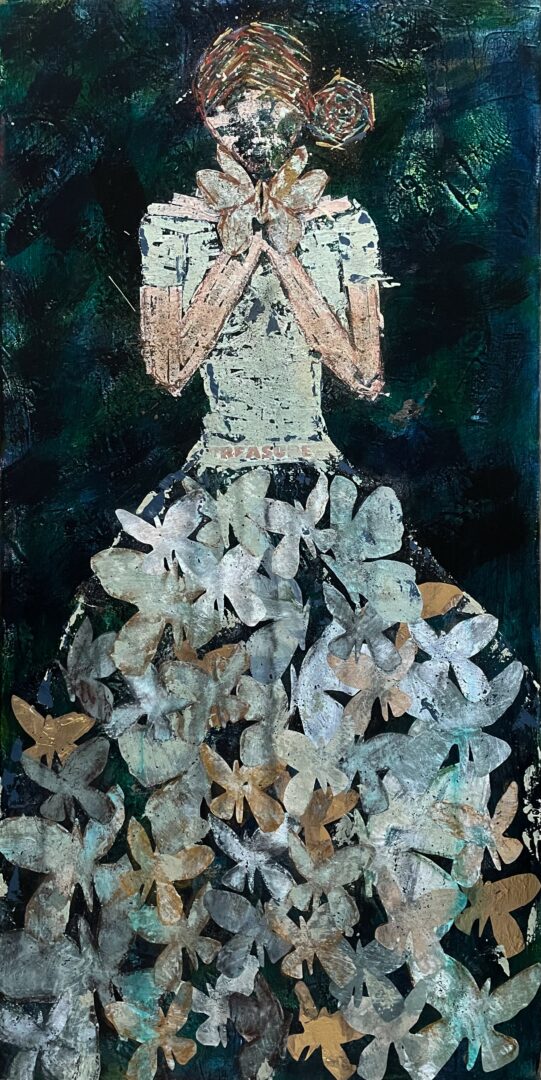 My art always tells a story. And it I layer everything that I’m feeling, learning, and doing in my life. Often I include cheap music from the music I am learning in my professional career. Sometimes it’s poetry from my favorite poet or words from the Bible. I always sent to my work around a relationship or a deep experience in my life. Because of this, you can look closely and see many layers throughout my work and all the layers are part of the story of the art.