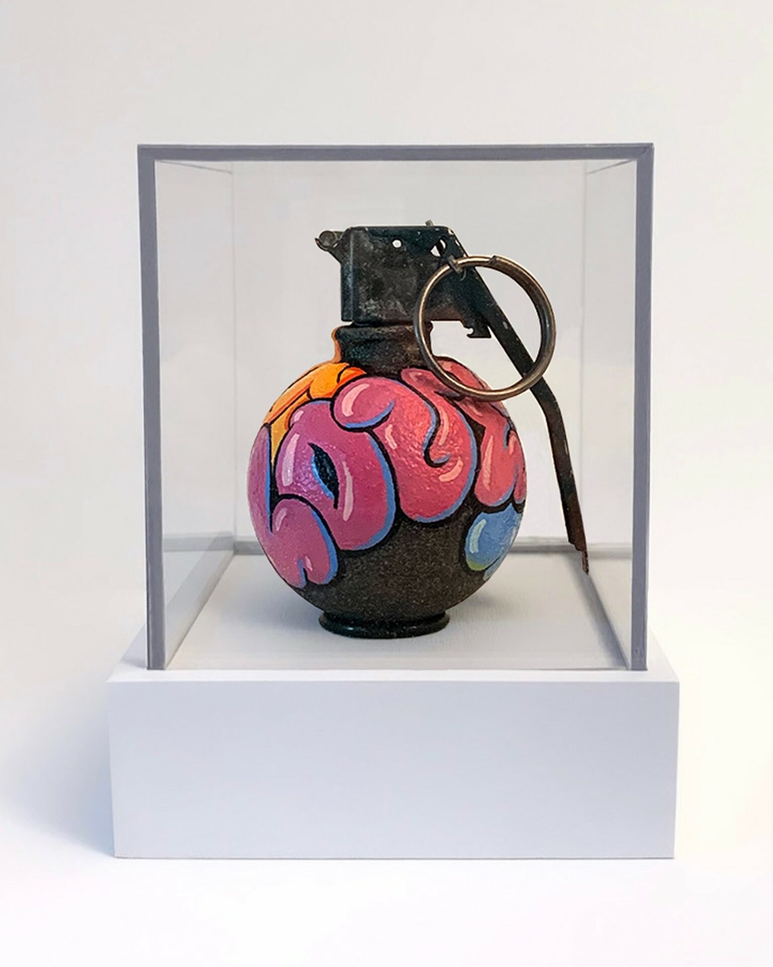 I expanded on the idea of the militarized female soldier and began painting on grenades creating, “Love Bombs” in early 2021 that touches on abuse and toxic situations. Love Bombing is a manipulation technique that a lot of abusers use to overwhelm their victims with gradiose displays of affection.