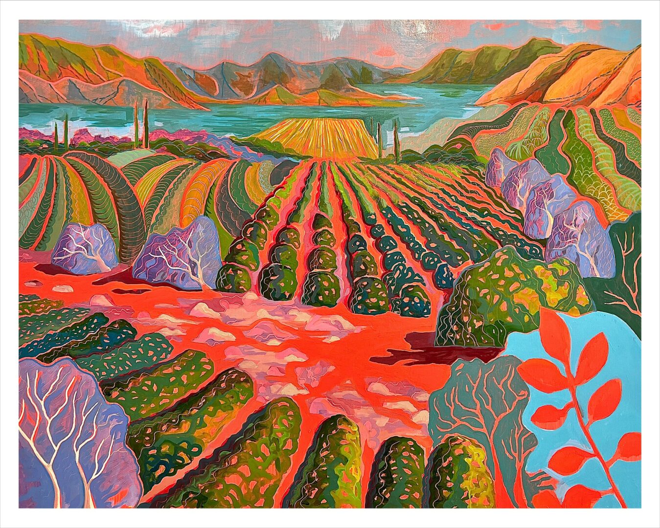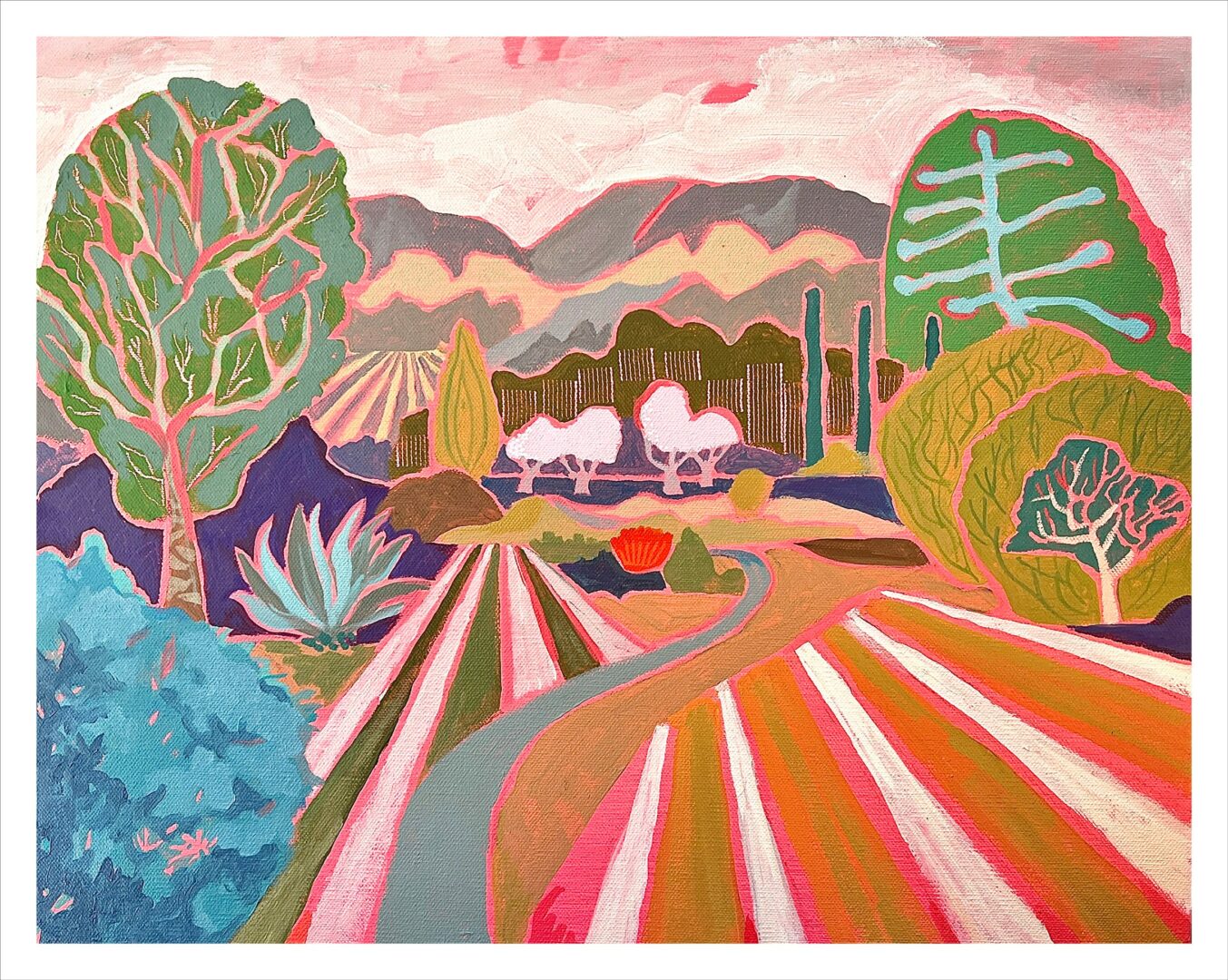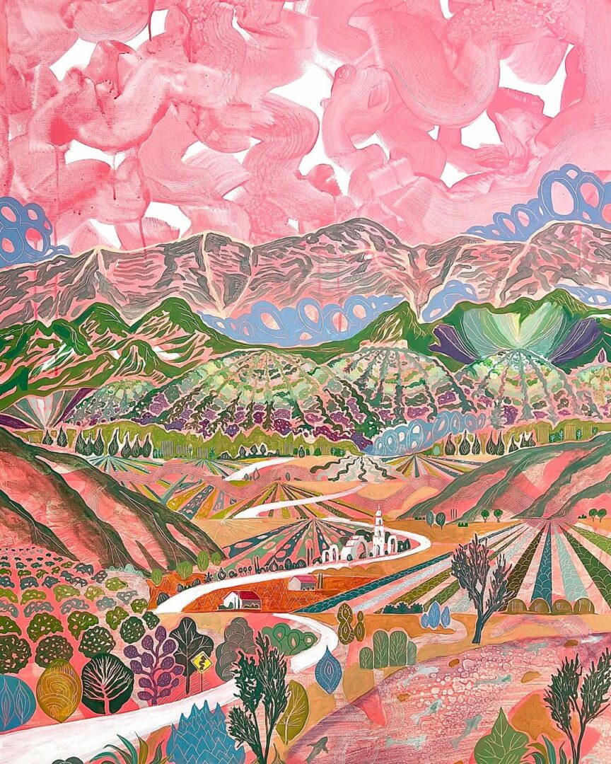 I’m a painter and writer based in Ojai, California, where I live and work in a studio tucked into a grove of olive trees. My work is maximalist, layered, and a little unruly—packed with brushmarks, scratches, curvy roads, bulbous clouds, boxy little houses, and fields of riotous color. I’m less interested in literal landscapes than in the spirit of place—the “thing behind the thing,” the mystery just behind the veil of what we can see. My pictures are intuitive, emotional, and driven by a desire to lose myself in the process and build worlds from feeling.