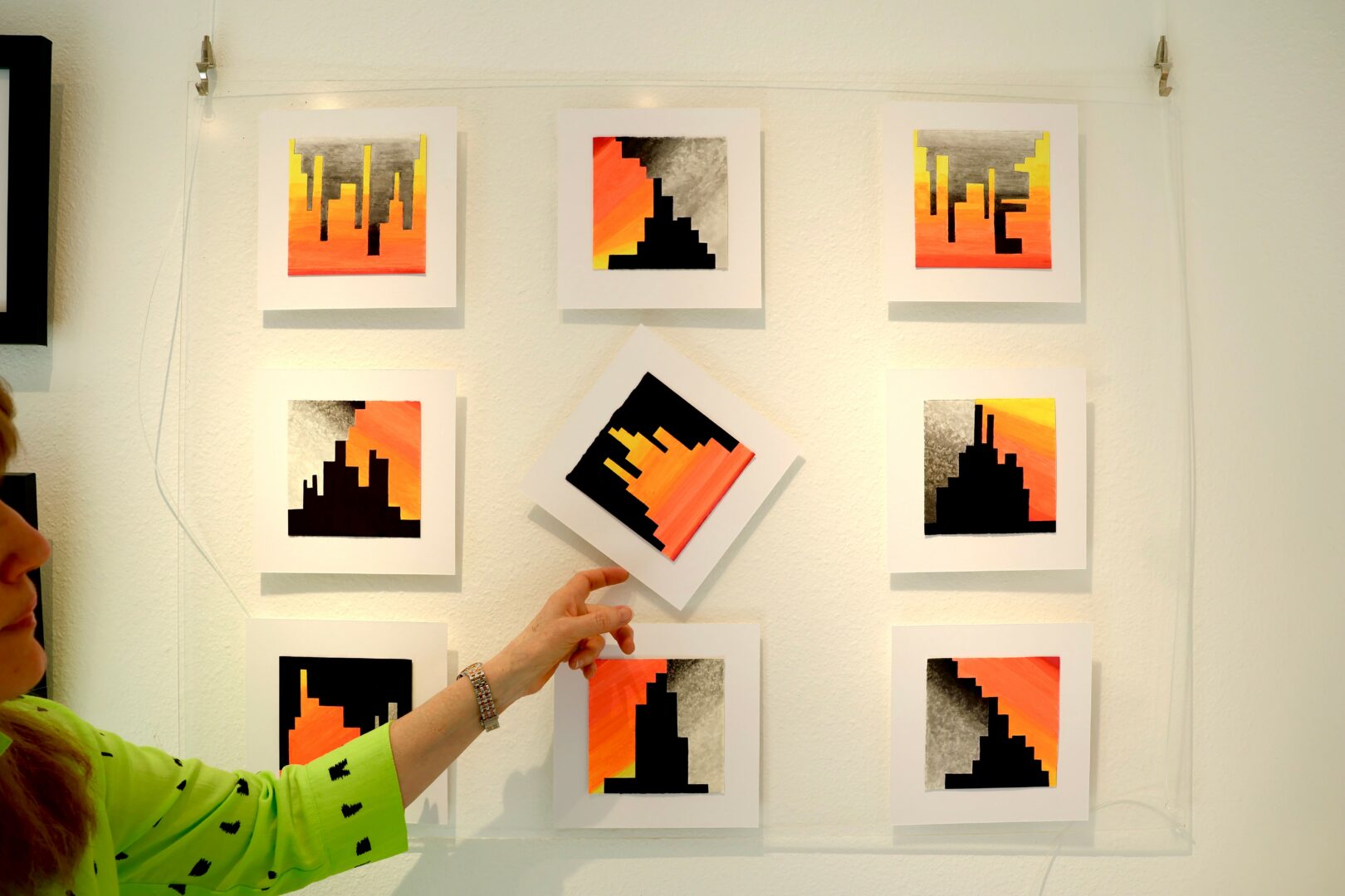 In my recent “Neon” series, I created a group of small abstract drawings in vivid fluorescent inks. Once I had a large number of them completed, I displayed them in a grid format on Plexiglas. This approach to display enabled me to change their positioning easily, and it allowed new relationships and synergies to emerge between the individual pieces.