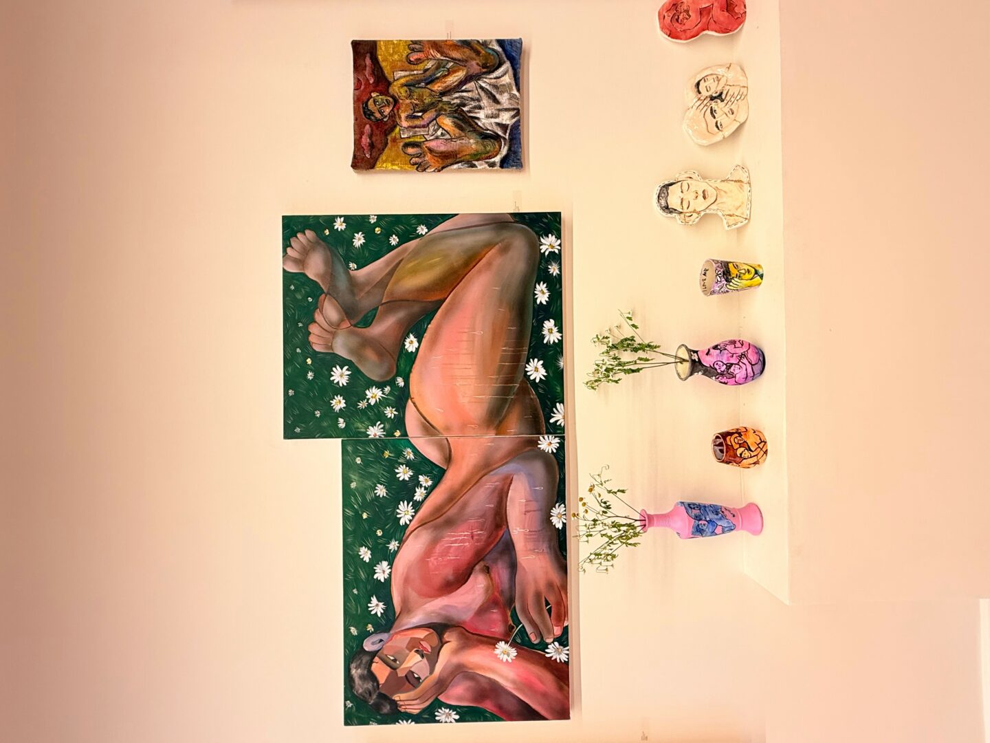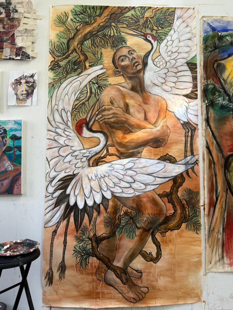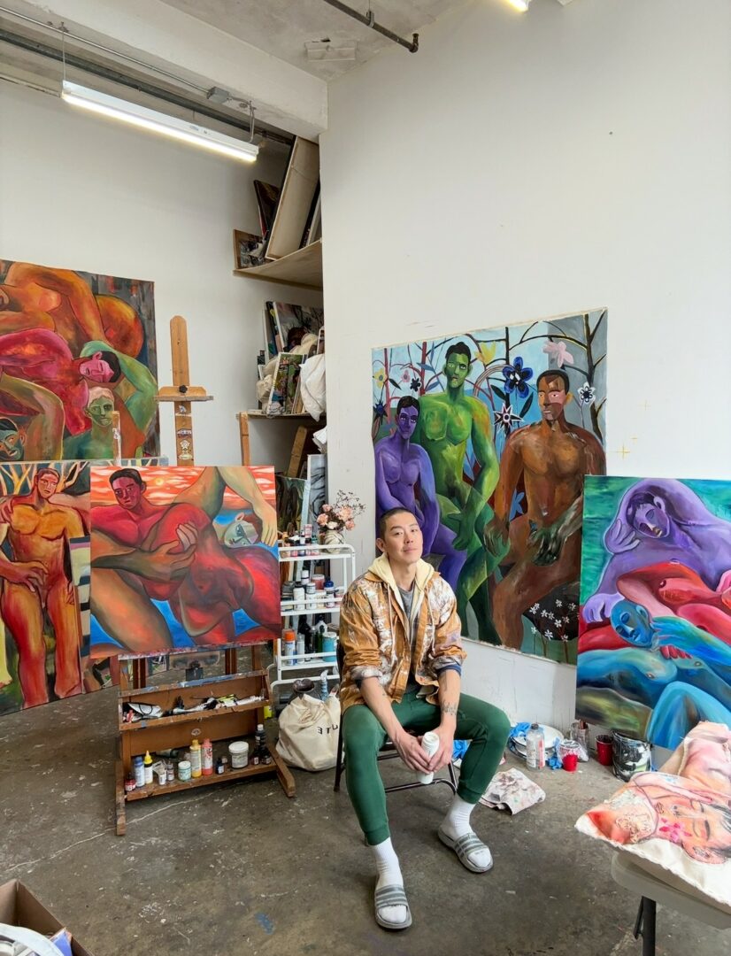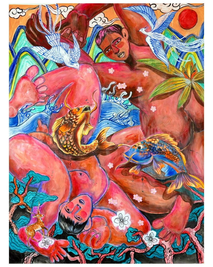 My paintings often depict queer figures resting or dancing in nature unapologetically, free, and alive. The city’s landscape and natural beauty inspire me deeply; I love being in nature because I found the queerness mirrored in nature’s diversity and resilience. Recently, my practice has expanded beyond the studio into community-based projects. I facilitate workshops with all age and type of people can participate, I collaborate with museums and organizations to make art sharable also brining my art outside studio and into public spaces has transformed how I see my purpose as an artist to connect, heal, and build community through creativity.