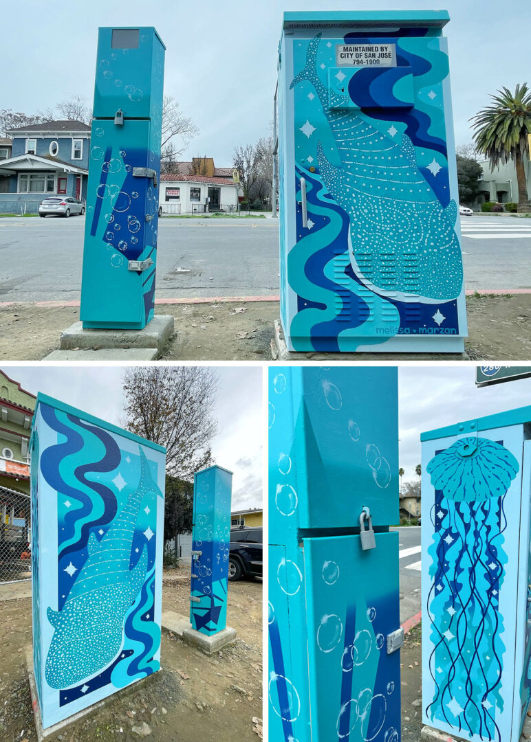 My art style is heavily inspired by my childhood being raised near the ocean in the central coast, always visiting the beaches, the Monterey Bay Aquarium, and trips to the Santa Cruz Beach Boardwalk. I also primarily work with a blue color palette because it can symbolize honesty and radiates friendly and calming energy.