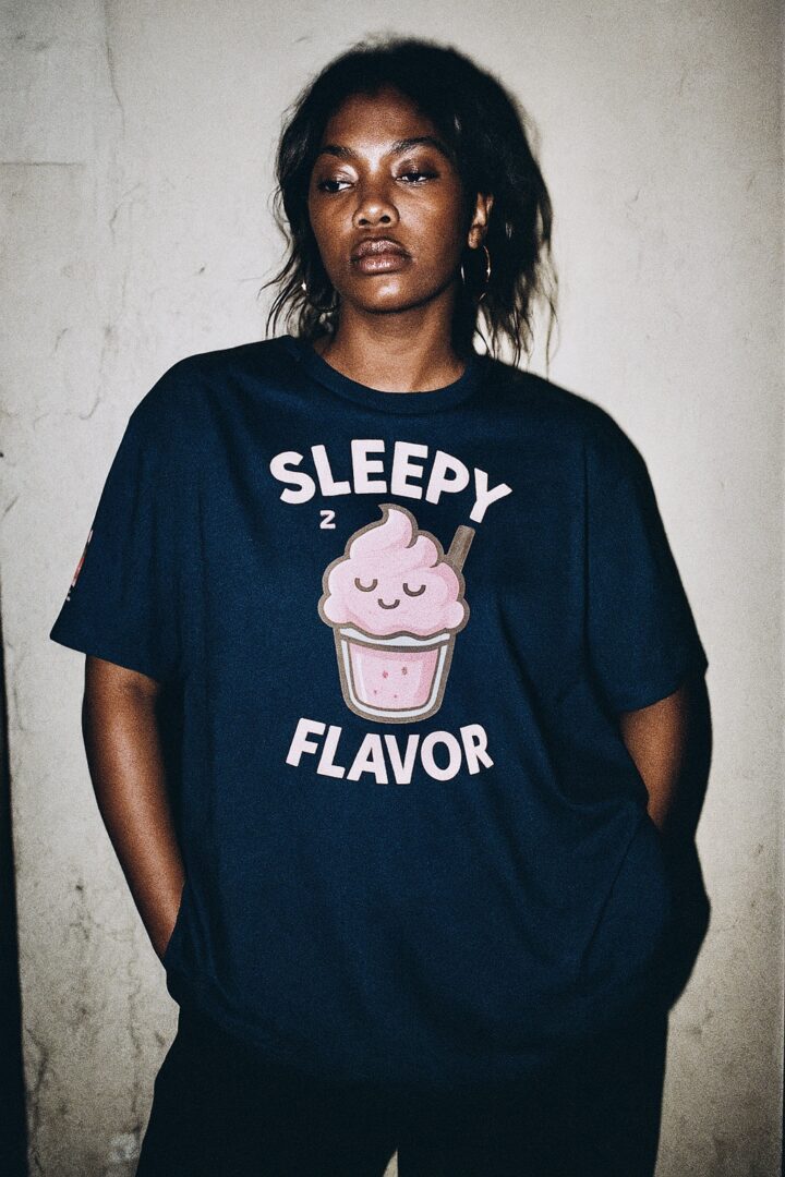 A good example is our ‘Heartbreaker’ windbreaker. I designed it after a breakup, with a heart in the middle that splits when you zip it down. Our Lucky collection was about gratitude, celebrating the near death experiences I’ve survived and turning that resilience into wearable good fortune. Most recently, I finished our biggest project yet: the Flavored Feelings collection. It’s 44 shirts, each one designed to capture a specific emotion or mood, from clingy to anxious to greedy to lazy. The idea was to make people look like a snack or something appetizing while also expressing the full spectrum of human feelings.